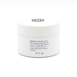Ingredients: Calendula, Spruce, & Lavender Infused Olive Oil, Coconut Oil, Beeswax, THC Oil, Vitamin E & Essential Oils of Juniper, Black Spruce, Birch, & Rosemary
